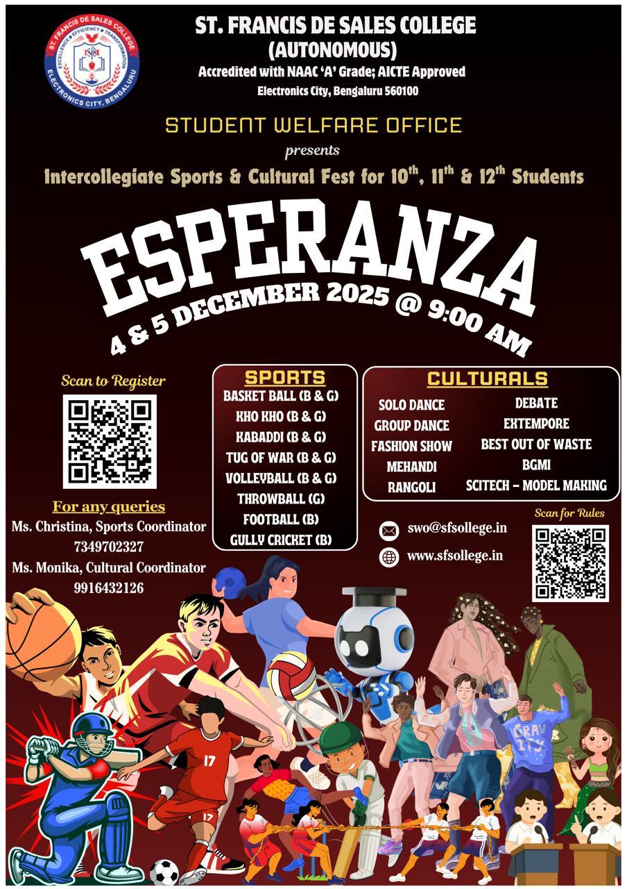 St. Francis de Sales College (Autonomous), popularly known as SFS College, is one of the leading Institutions of Higher Education in Bengaluru, Karnataka. Founded in 2004 with the vision of Excellence, Efficiency, and Transformation, the College is run by the Missionaries of St. Francis de Sales (MSFS) of the South West India Province, also known as Fransalians.
